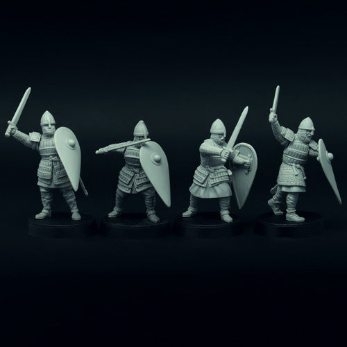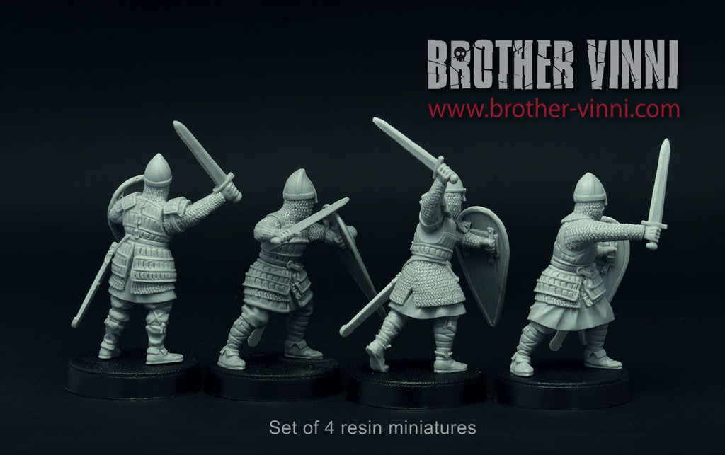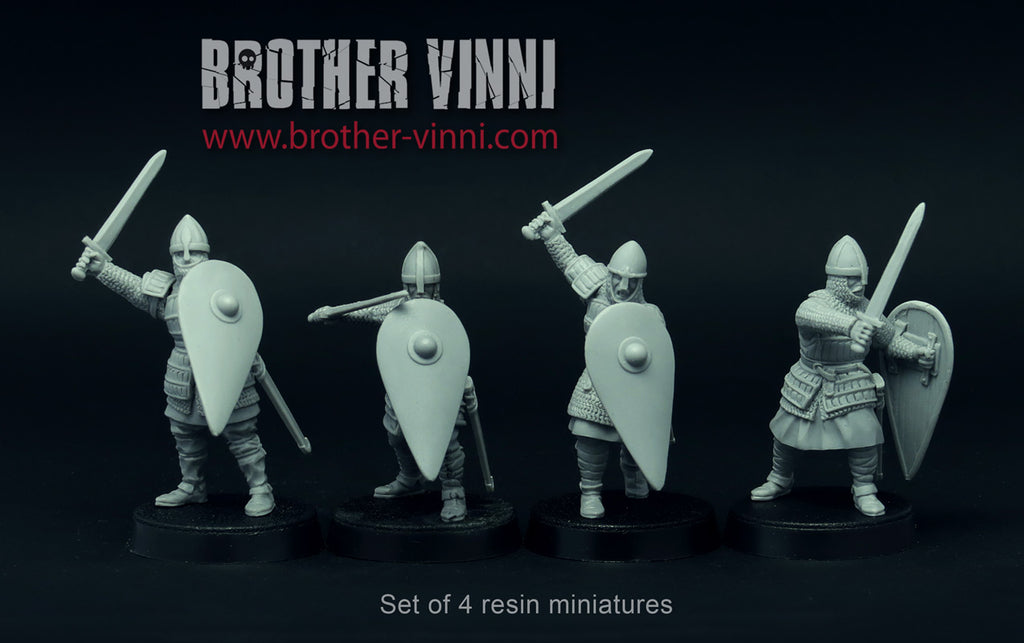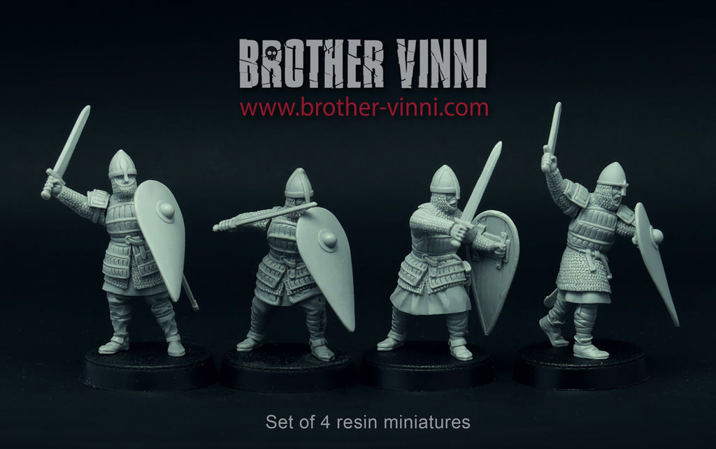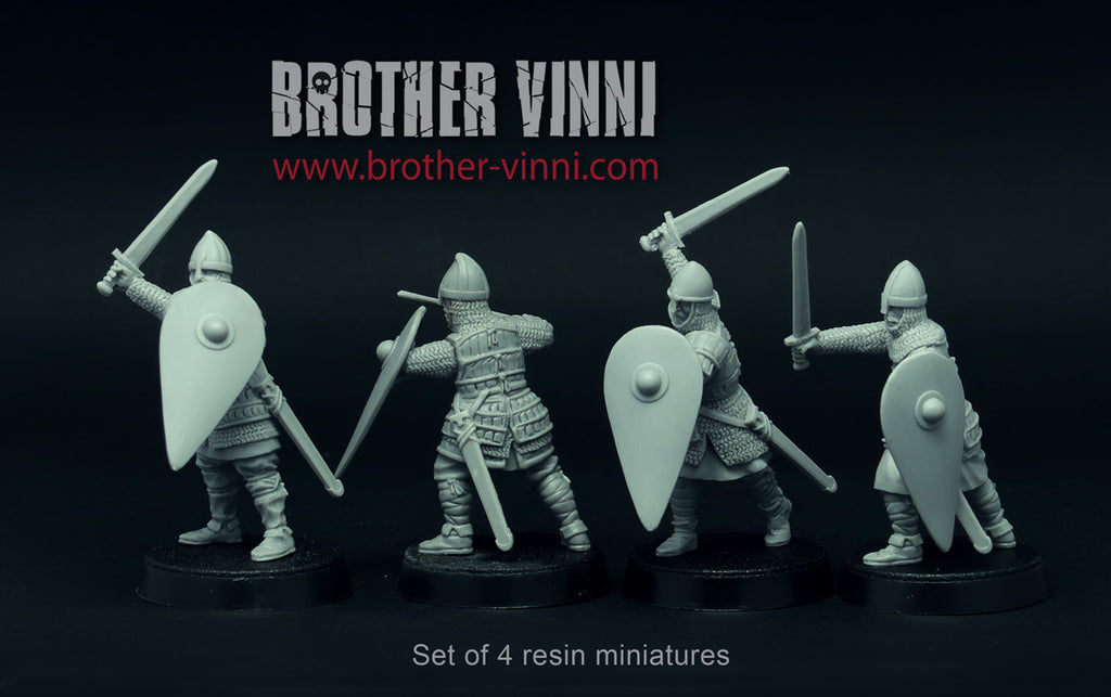 Italian Normans miniatures (28 mm miniatures). The set of 4 high-quality resin miniatures depicts Normans on South, they are armed with swords and typical drop-shaped shields. This set would be a good addition for any SAGA warband or just for playing fantasy wargames. Miniatures designed and casted by Brother Vinni's studio.
