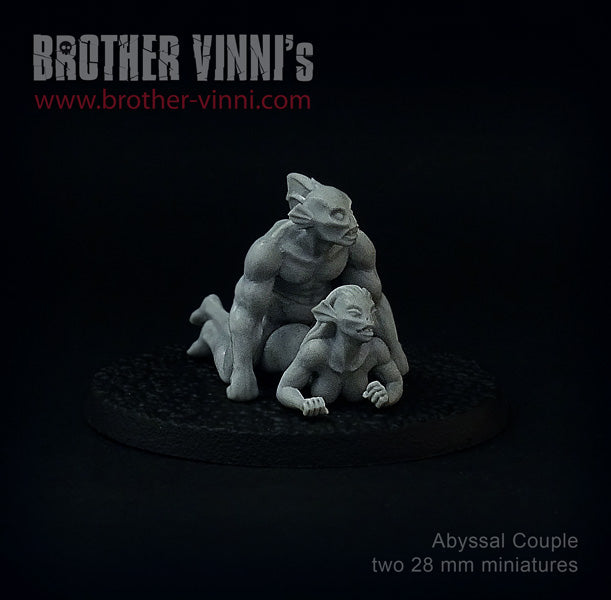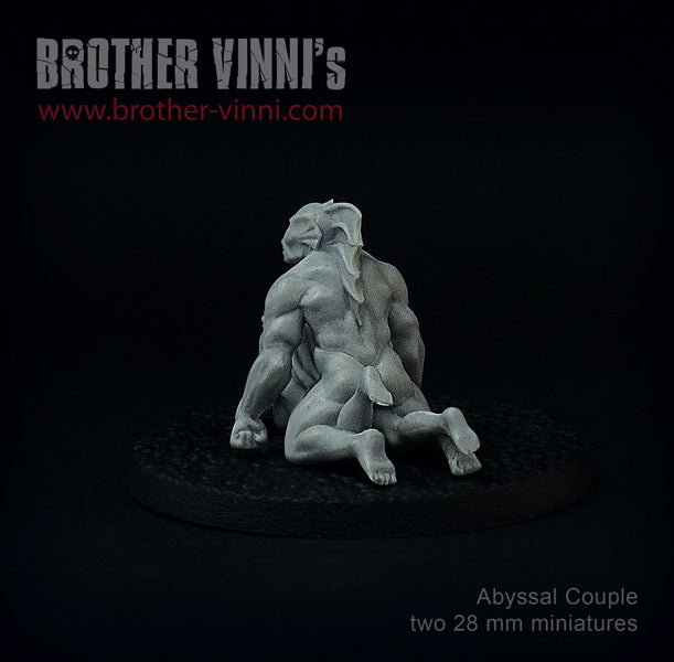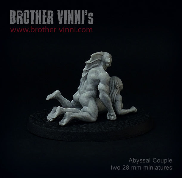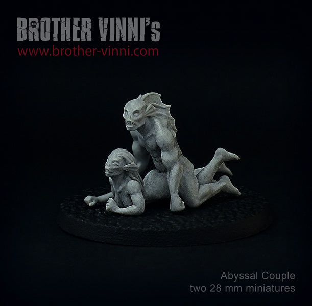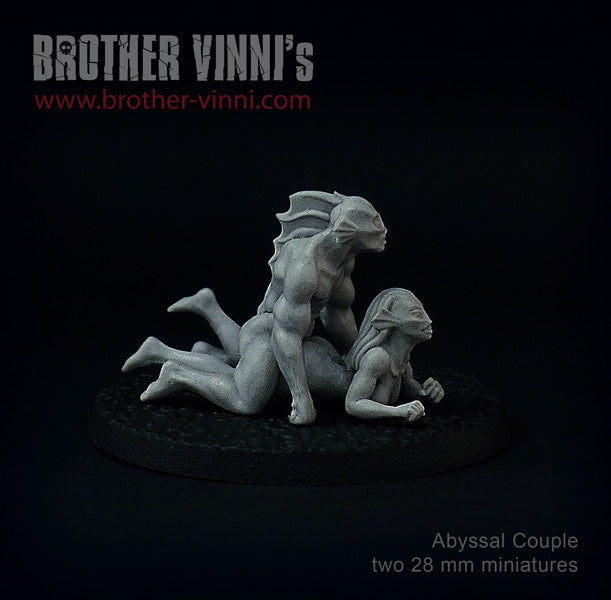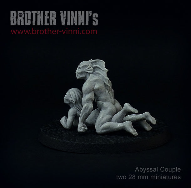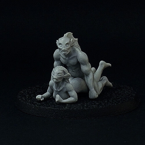 Set of two 28 mm resin miniatures, fish man and fish woman.