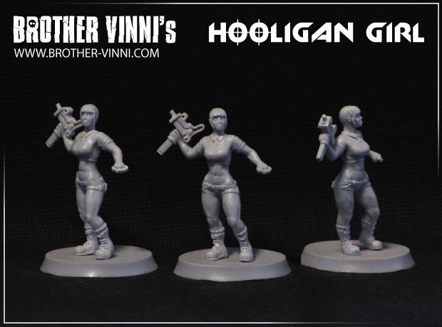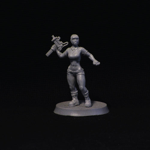 Hooligan girl (skinhead girl) in short jeans armed with "ingram" gun, 28 mm wargame miniature